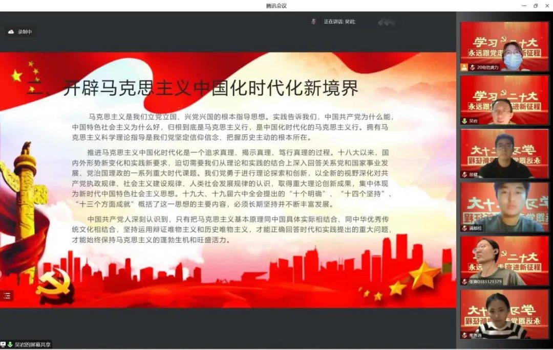 会上,吴岩老师带领与会人员认真学习了党的二十大报告中“开辟马克思主义中国化时代化新境界、新时代新征程中国共产党的使命任务”等内容,重点学习了不断谱写马克思主义中国化时代化新篇章,是当代中国共产党人的庄严厉史责任;以中国式现代化全面推进中华民族伟大复兴;前进道路上必须牢牢把握的重大原则。通过观看视频《领悟·一起学报告》深入学习解码中国式现代化。