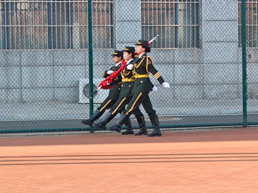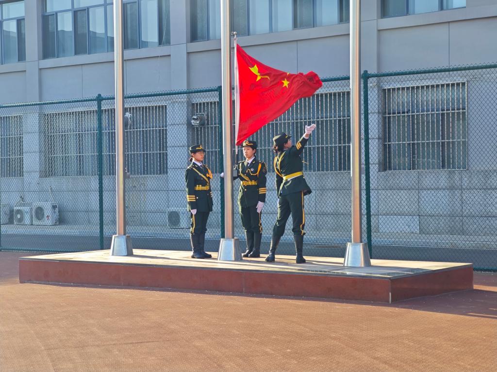 国旗护卫队的队员们,身着整齐的制服,迈着铿锵有力的步伐,向旗杆走来。他们精神抖擞,身姿挺拔,随着升旗手振臂一挥,鲜艳的五星红旗冉冉升起,迎风飘扬,象征着中华民族昂扬向上的精神风貌。