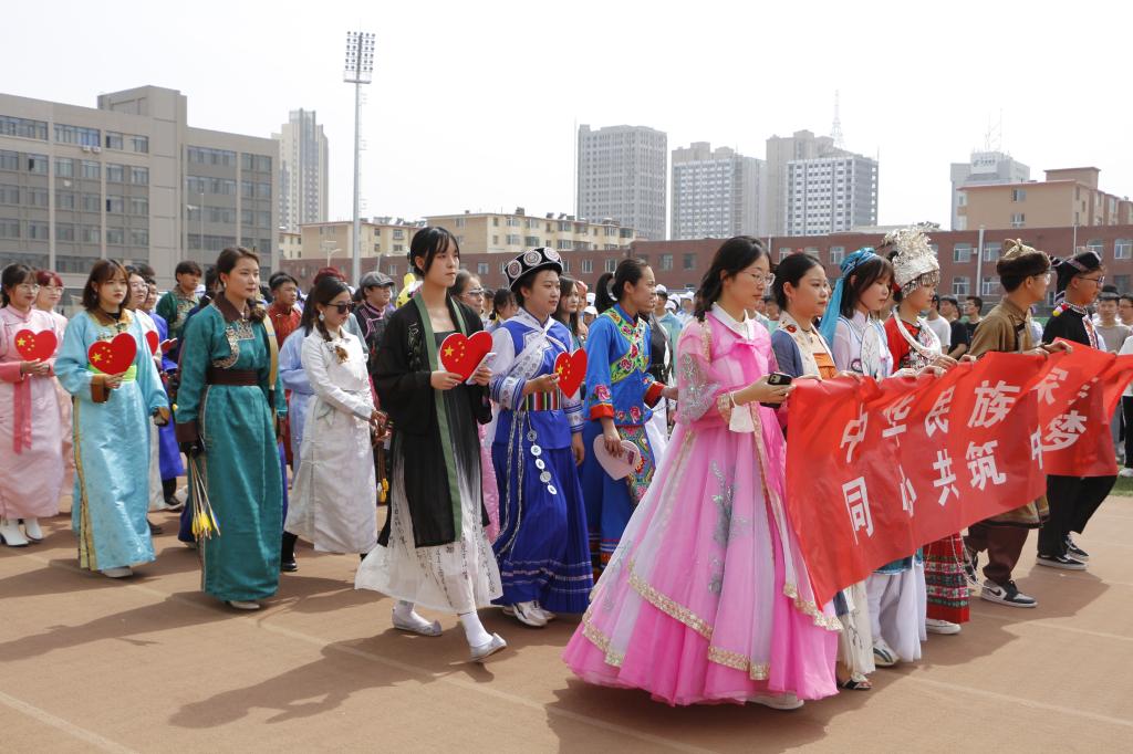 “金石榴民族团结方阵首先迈上了校园健步走,他们身着民族服饰,尽显多彩风情,展现各族学子的团结奋进。