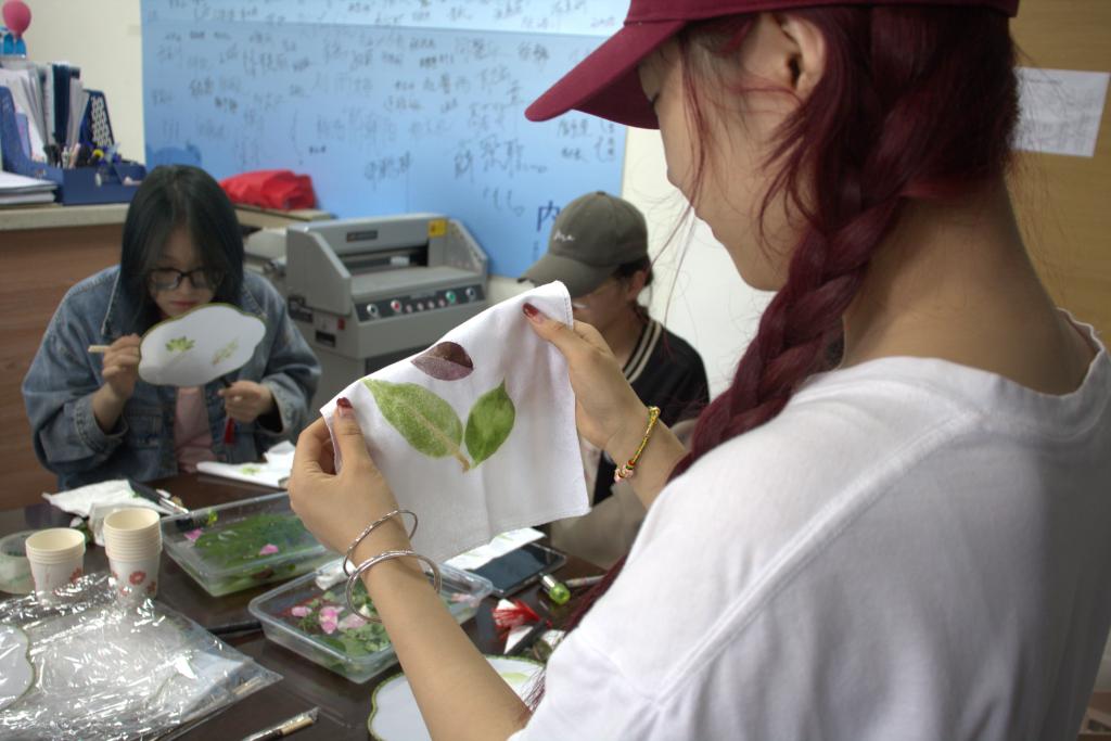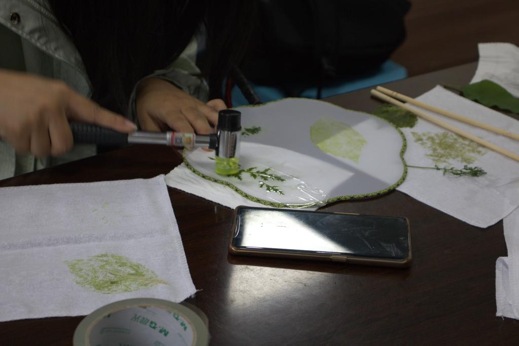 在老师的指导下,我们开始了拓染之旅。那一抹绿、一分彩、一素色,在同学们的手中晕染开来,形成了一幅幅独特的艺术作品。每一株草、每一束花、每一块布,都敲拓出了我们对自然的热爱与尊重。在这里,我们不仅是学习者,更是创作者。我们用心去感受植物的美,用双手去拓印它们的色彩。在这个过程中,我们释放了创意,展现了自我,也感受到了自然的魅力。