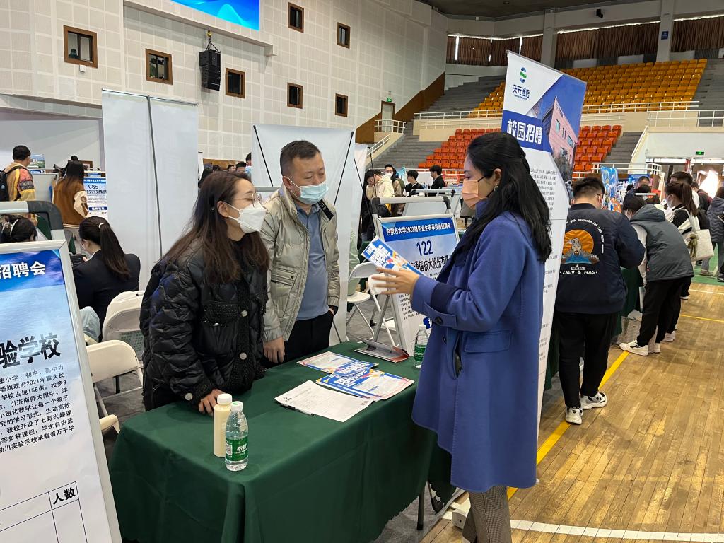 公司党委书记萨奇尔在招聘会现场与用人单位交流