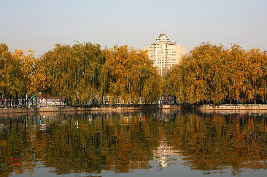 湖前,理工楼的轮廓被月光描摹,蒙古包的尖顶直插云天,在深秋的暗色天空下,自有厚重的气息弥漫。秋叶随风而起,又哗啦啦的随风而去,终轻轻飘落在洁白高大的楼梯上,轻轻的吻    着层层阶梯,沉沉的睡去。