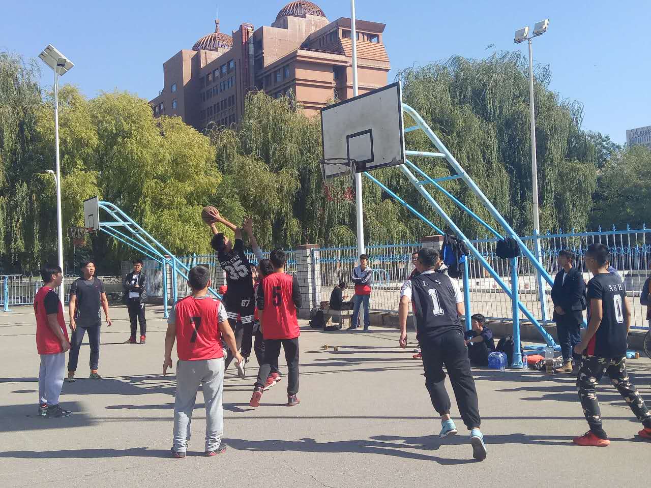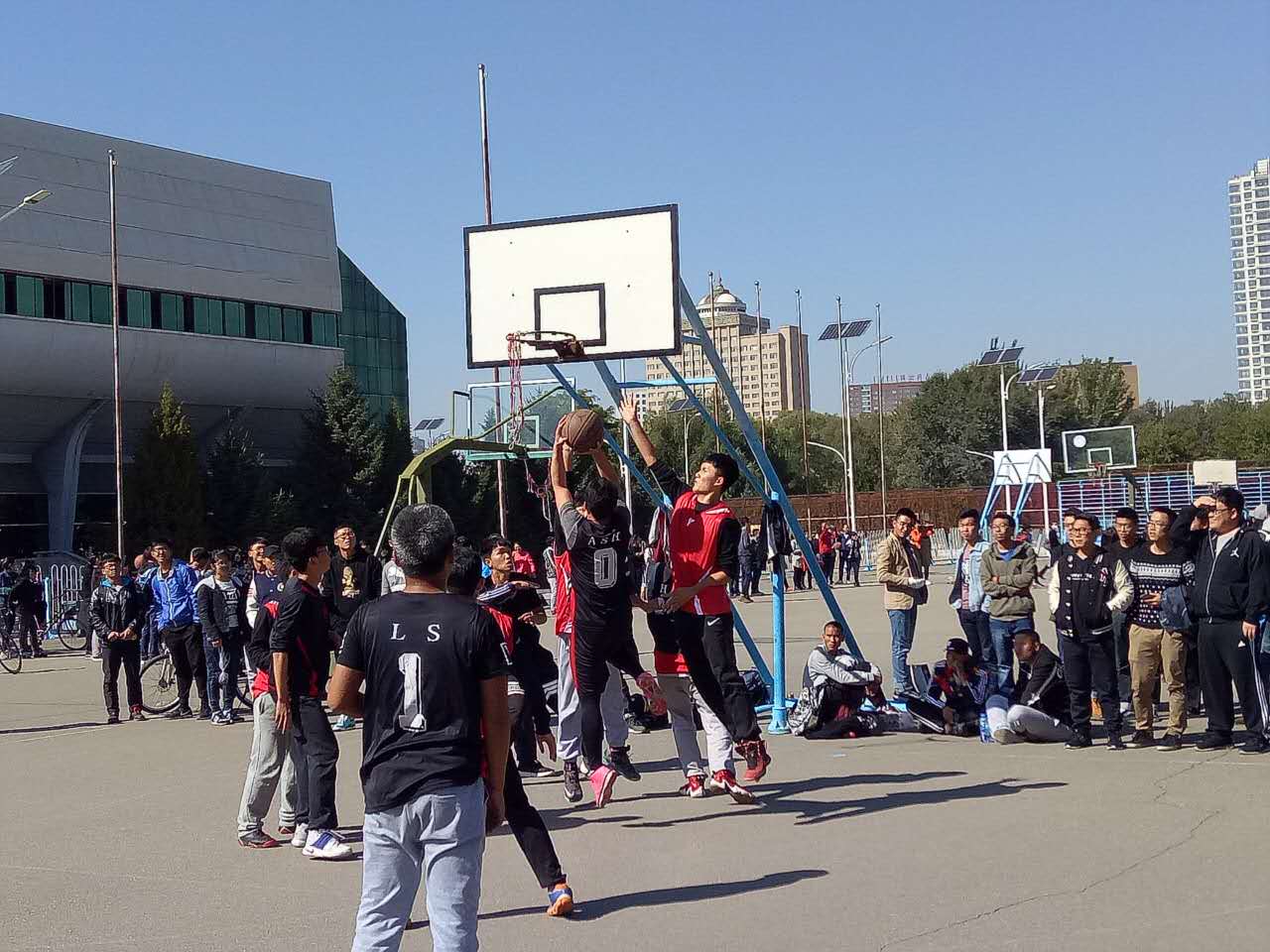 比赛开始后,环资队队员敏捷迅速,抢占先机,电信队及时防守,截断投球.双方啦啦队不断为球员们的精彩表现呐喊助威,虽然天气较冷,但球员们在奔跑,跳跃和投篮中仍激情四射,青春洋溢。战势如火如荼,”好球””加油”之声震耳欲聋。